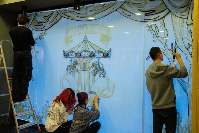 Tras varias jornadas de trabajo —y sí, con nuestro ya característico tiempo donostiarra—, los cristales se han llenado de color, creatividad y espíritu carnavalero. Horas de dedicación que han trasladado el diseño a la calle y han llenado la ciudad de alegría y movimiento.